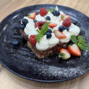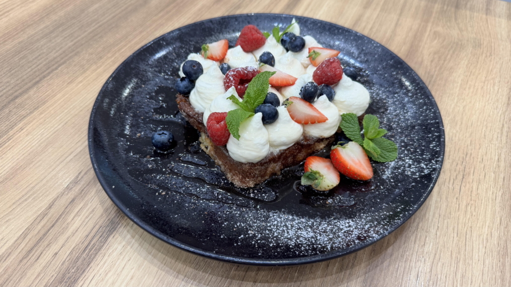vafle, javorový sirup, čerstvé ovoce, šlehačka